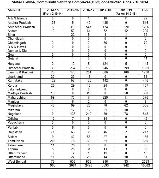 • Between 2nd October, 2014 and 24th May, 2018, the total number of Community Sanitary Complexes (CSC) constructed in India under the SBM (G) was nearly 10,002. Most number of CSCs construction under the SBM (G) during this span took place in West Bengal (2,063), followed by Arunachal Pradesh (1,266), Jammu & Kashmir (1,238), Himachal Pradesh (1,081) and Andhra Pradesh (616).