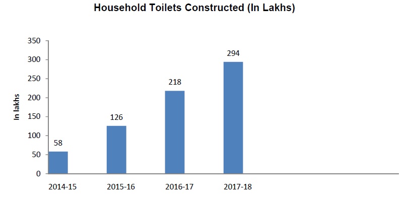 • According to the MDWS, the number of household toilets constructed was 58 lakhs in 2014-15, 126 lakhs in 2015-16, 218 lakhs in 2016-17 and 294 lakhs in 2017-18.