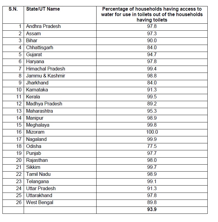 • As per the Swachhata Status Report 2016 of National Sample Survey Office (NSSO), the proportion of households having access to water for use in toilets out of the households having toilets was the lowest in Odisha (77.5 percent), followed by Jharkhand and Chhattisgarh (both 84.0 percent), Madhya Pradesh (89.2 percent), West Bengal (89.8 percent) and Bihar (90.0 percent). At the national level, this figure was 93.9 percent.