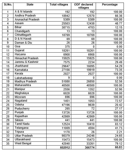 • As on 24th May, 2018, nearly 60.83 percent of total villages (viz. 6,02,912) in the country were ODF. The proportion of villages, which were found to be ODF, is the lowest in Goa and Lakshadweep (both zero percent), followed by Tripura (2.21 percent), Bihar (12.15 percent), Odisha (20.42 percent) and Uttar Pradesh (24.65 percent).