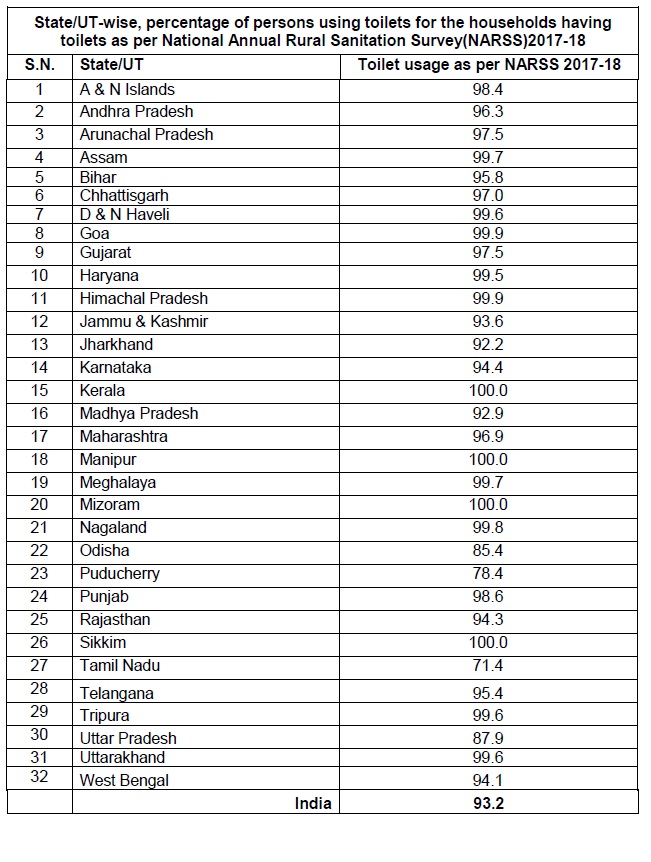 • As per the National Annual Rural Sanitation Survey (2017-18), the proportion of persons using toilets for the households having toilets was the lowest in Tamil Nadu (71.4 percent), followed by Puducherry (78.4 percent), Odisha (85.4 percent), Uttar Pradesh (87.9 percent) and Jharkhand (92.2 percent). At the national level, this figure was 93.2 percent.
