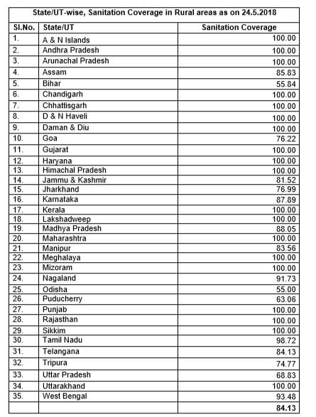 • Sanitation coverage as on 24th May, 2018 in rural areas of Bihar was 55.84 percent, Assam was 85.83 percent, Goa was 76.22 percent, Jammu & Kashmir was 81.52 percent, Jharkhand was 76.99 percent, Karnataka was 87.89 percent, Madhya Pradesh was 88.05 percent, Manipur was 83.56 percent, Nagaland was 91.73 percent, Odisha was 55.0 percent, Puducherry was 63.06 percent, Tamil Nadu was 98.72 percent, Uttar Pradesh was 68.83 percent, Tripura was 74.77 percent, Telangana was 84.13 percent and West Bengal was 93.48 percent.
