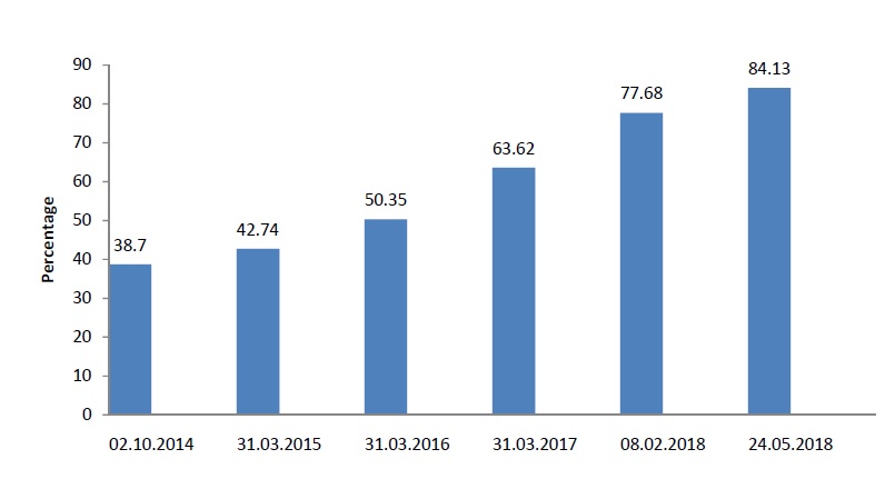 • During the time of launch of the SBM (G) on 2nd October, 2014, the sanitation coverage in the country was 38.7 percent. This has increased to 84.13 percent as on 24th May, 2018.