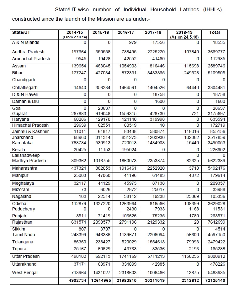 • Between 2nd October, 2014 and 24th May, 2018, the total number of individual household latrines (IHHLs) constructed in India under the SBM (G) was nearly 7.2 crore. Most IHHL construction under the SBM (G) during this span took place in Uttar Pradesh (around 98 lakhs), followed by Rajasthan (76.4 lakhs) and Madhya Pradesh (56.2 lakhs). As per the Cabinet Note, 9.72 crore IHHLs (8.84 crore eligible for incentive and 0.88 crore non-eligible for APLs) to be constructed under SBM (G), says the report.