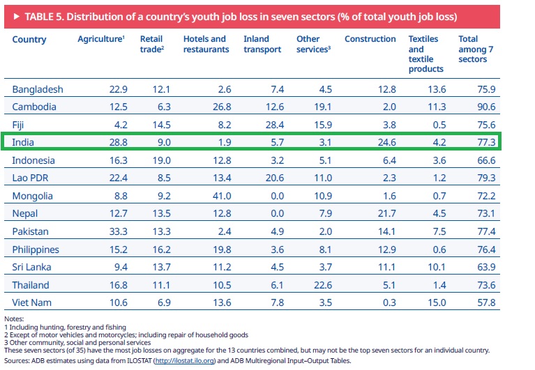 The report (please click here to access) entitled Lessons for Social Protection from the COVID-19 Lockdowns Report 1 of 2: State Relief (released in February, 2021) seeks to use COVID-19 and its attendant lockdowns in India as a crucial moment to assess the protective aspect of social protection, asking three interrelated questions: First, what do the immediate relief measures put into place to cope with the impact of COVID-19 and the lockdowns tell us about the current state of social protection systems? Second, how did these measures effectively target and deliver relief in complex and constrained situations such as the lockdowns? Third, going forward, what lessons does this set of immediate relief measures offer not just for medium-term recovery but for designing, building and improving social protection systems? The authors — Gautam Bhan, Antara Rai Chowdhury, Neha Margosa, Kinjal Sampat and Nidhi Sohane — chose to focus on three kinds of relief that are closely related to social protection: food, cash transfer and labour protections, analysing 181 announcements between March 20 and May 31, 2020, covering the four phased lockdowns announced by the Government of India. The archive focuses on announcements, circulars, notifications, and orders about these three kinds of relief. Across them, the researchers employed three key analytical frames that structure the report; identification, defining entitlements, and delivery mechanisms – key components of the actually existing practice of any social protection system. The first part focuses on identification, looking closely at eligibility criteria to be part of a relief scheme, verification processes, as well as the use of databases to direct relief. The second part looks at defining entitlements themselves, assessing what was given as relief, and consider the factors that led to this determination. The third part then looks at delivery mechanisms, focusing on the modes, processes, and actors responsible for ensuring the promised entitlement actually reached the right person within an appropriate time frame. Relief measures implemented during the lockdown are a rich archive against which to assess each. These measures both continued, used and expanded existing systems of design and delivery but also innovated with “temporary” measures that created new categories of recipients, new forms of entitlements, and new mechanisms of delivery. It is crucial that we learn from both the continuities and innovations of the social protection measures implemented in this time in order to improve and expand these systems in a post-COVID world. — Kindly click here to access the ILO report Working from home: From invisibility to decent work (released in January 2021). — Please click here, here and here to read the key findings of the report entitled Time Use in India-2019, January-December 2019 (released in September 2020), prepared by National Statistical Office, Ministry of Statistics and Programme Implementation. — Please click here to read the Briefing Note for Parliamentarians on Labour Law Reforms prepared by Working Peoples' Charter dated 21st September, 2020. Please click here to read The Code on Social Security 2020. Please click here to read The Occupational Safety, Health and Working Conditions Code 2020. Please click here to read The Industrial Relations Code 2020. Please click here to read The Code on Wages 2019. Please click here to access the Parliamentary Standing Committee Report on Labour 2019-20, The Code on Social Security 2019 (released in July 2020), Ninth Report, Seventeenth Lok Sabha. Please click here to access the Parliamentary Standing Committee Report on Labour 2019-20, The Industrial Relations Code 2019 (released in April 2020), Eighth Report, Seventeenth Lok Sabha. Please click here to access the Parliamentary Standing Committee Report on Labour 2019-20, The Occupational Safety, Health and Working Conditions Code 2019 (released in February 2020), Fourth Report, Seventeenth Lok Sabha. Please click here to access the Parliamentary Standing Committee Report on Labour 2018-19, The Code on Wages Bill 2017 (released in December 2018), Forty Third Report, Sixteenth Lok Sabha. Please click here to access the Parliamentary Standing Committee Report on Labour 2014-15, The Factories (Amendment) Bill 2014 (released in December 2014), Third Report, Sixteenth Lok Sabha. — The key findings of the report entitled Tackling the COVID-19 youth employment crisis in Asia and the Pacific (released on 18th August, 2020) by Asian Development Bank (ADB) and International Labour Organisation (ILO), are as follows (please click here to access) • Under 3-months containment scenario (short containment), in India, the equivalent of 4.1 million youth jobs may be lost, followed by Pakistan with 1.5 million jobs lost. • Under 6-months containment scenario (long containment), in India, the equivalent of 6.1 million youth jobs may be lost, followed by Pakistan with 2.3 million jobs lost. • In Fiji (29.8 percent), India (29.5 percent) and Mongolia (28.5 percent), the youth unemployment rate may rise to near 30 percent, and may be just over that level in Sri Lanka (32.5 percent) under short containment (3-months). • Under long containment (6-months), youth unemployment rate may increase to 32.5 percent in India. • The highest proportion of youth job loss among the seven sectors in India would be felt in agriculture (28.8 percent), followed by construction (24.6 percent), retail trade (9.0 percent), inland transport (5.7 percent), textiles and textile products (4.2 percent), other services (3.1 percent) and hotels and restaurants (1.9 percent). The other sectors of the economy would be responsible for 22.7 percent of youth job losses. • Job loss among youth will continue throughout 2020 and could result in youth unemployment rates doubling. Between 10 and 15 million youth jobs (full-time equivalent) may be lost across 13 countries in 