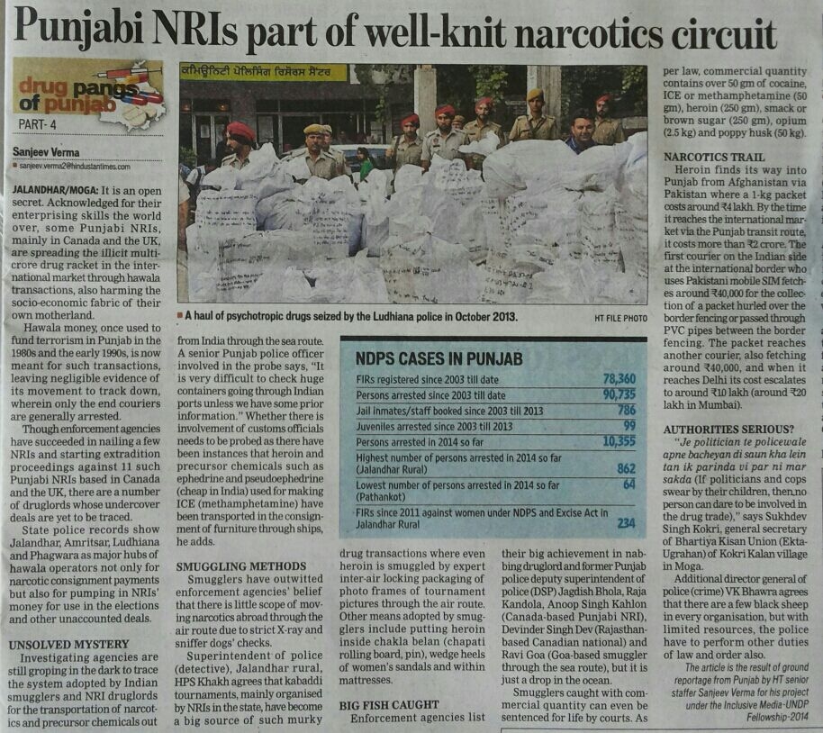 - Article 4: Punjabi NRIs part of well-knit narcotics circuit-Sanjeev Verma, October 1, The Hindustan Times, Chandigarh