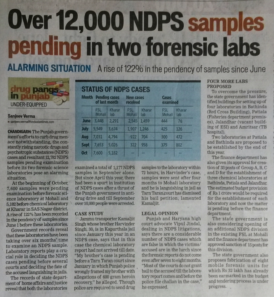 - Article 5: Over 12,000 NDPS samples pending in two forensic labs-Sanjeev Verma, November 6, The Hindustan Times, Chandigarh