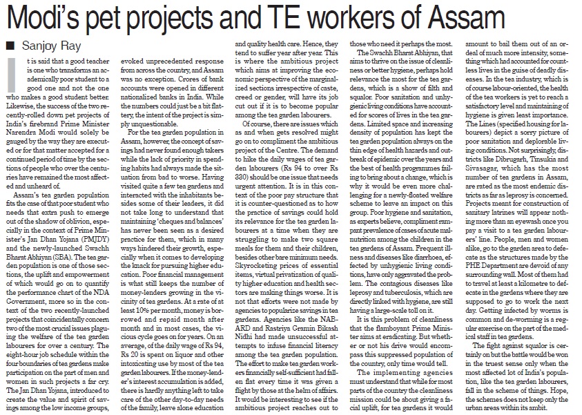 - Article 4: Modi’s pet projects and TE workers of Assam -Sanjoy Ray, 7 October 2014, The Assam Tribune (Guwahati)