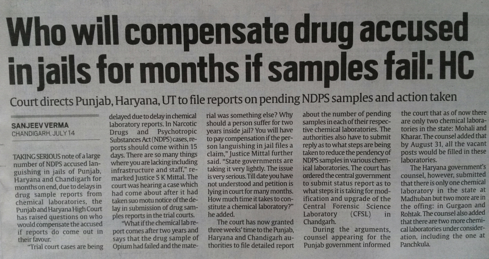 - Article 7: Who will compensate drug accused in jails for months if samples fail: HC -Sanjeev Verma, The Indian Express, Chandigarh, 14 July, 2015