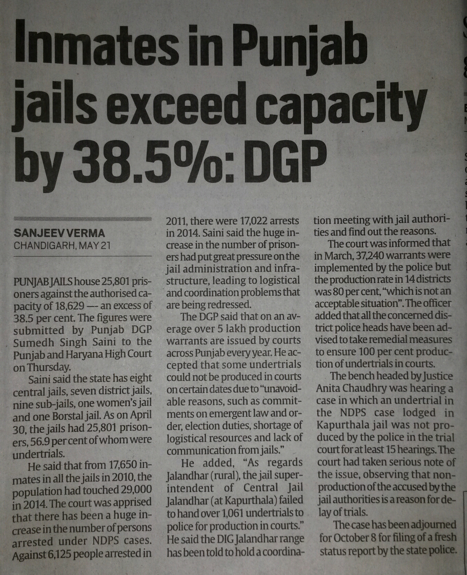 - Article 6: Inmates in Punjab jails exceed capacity by 38.5%: DGP -Sanjeev Verma, The Indian Express, Chandigarh, 21 May, 2015
