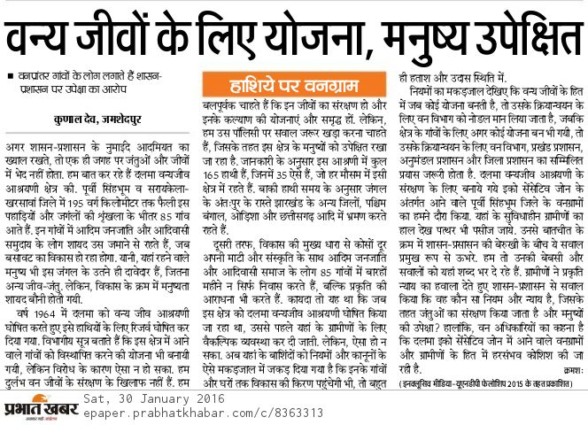 - 1. वन्यजीवों के लिए योजना,मनुष्य उपेक्षित -Kunal Deo, 30 जनवरी, 2016, प्रभात खबर (झारखंड)