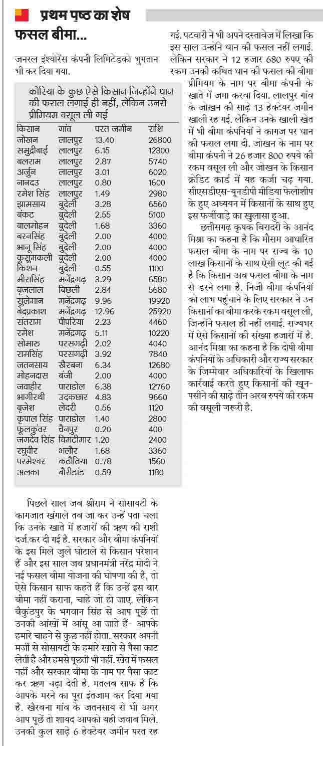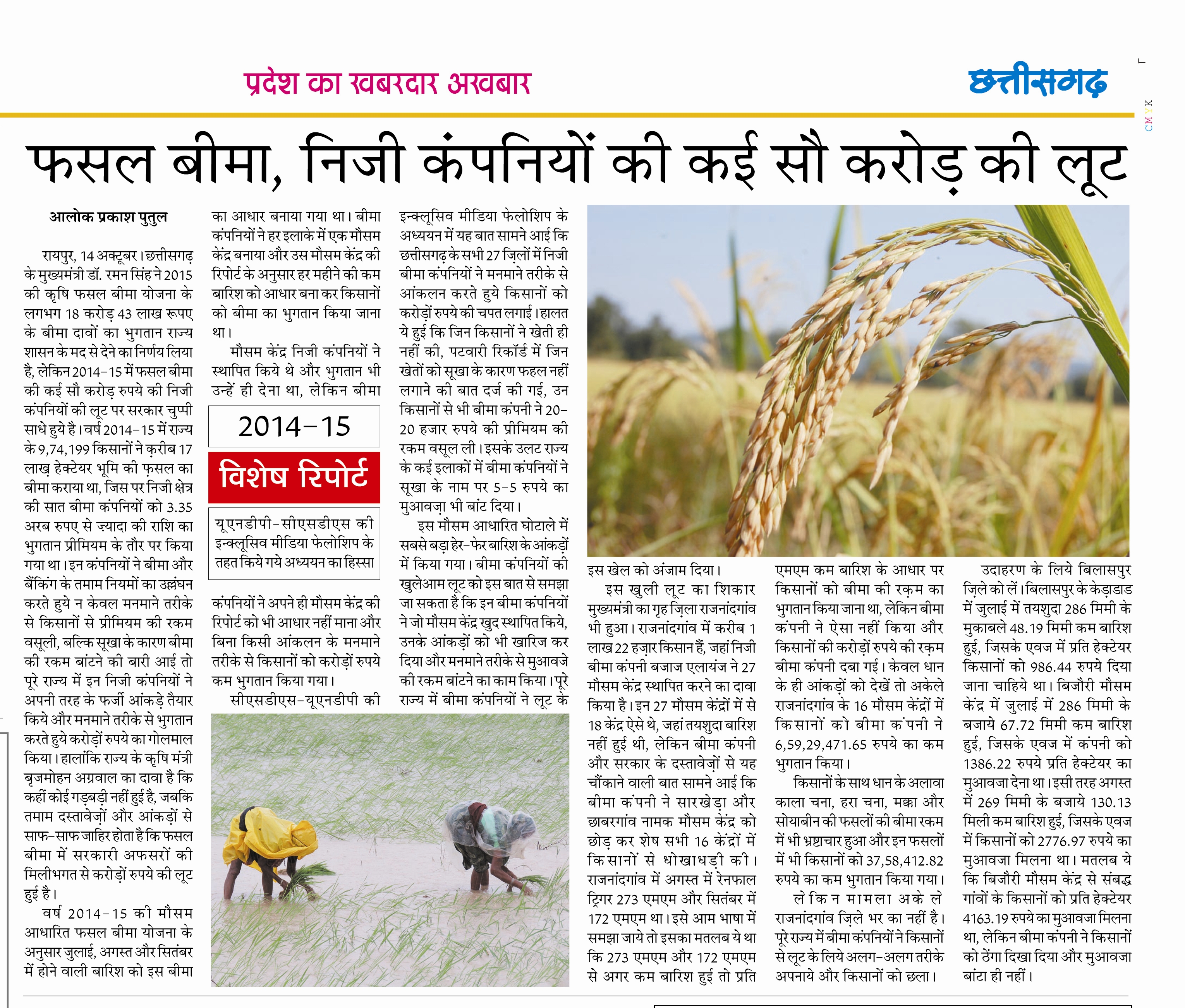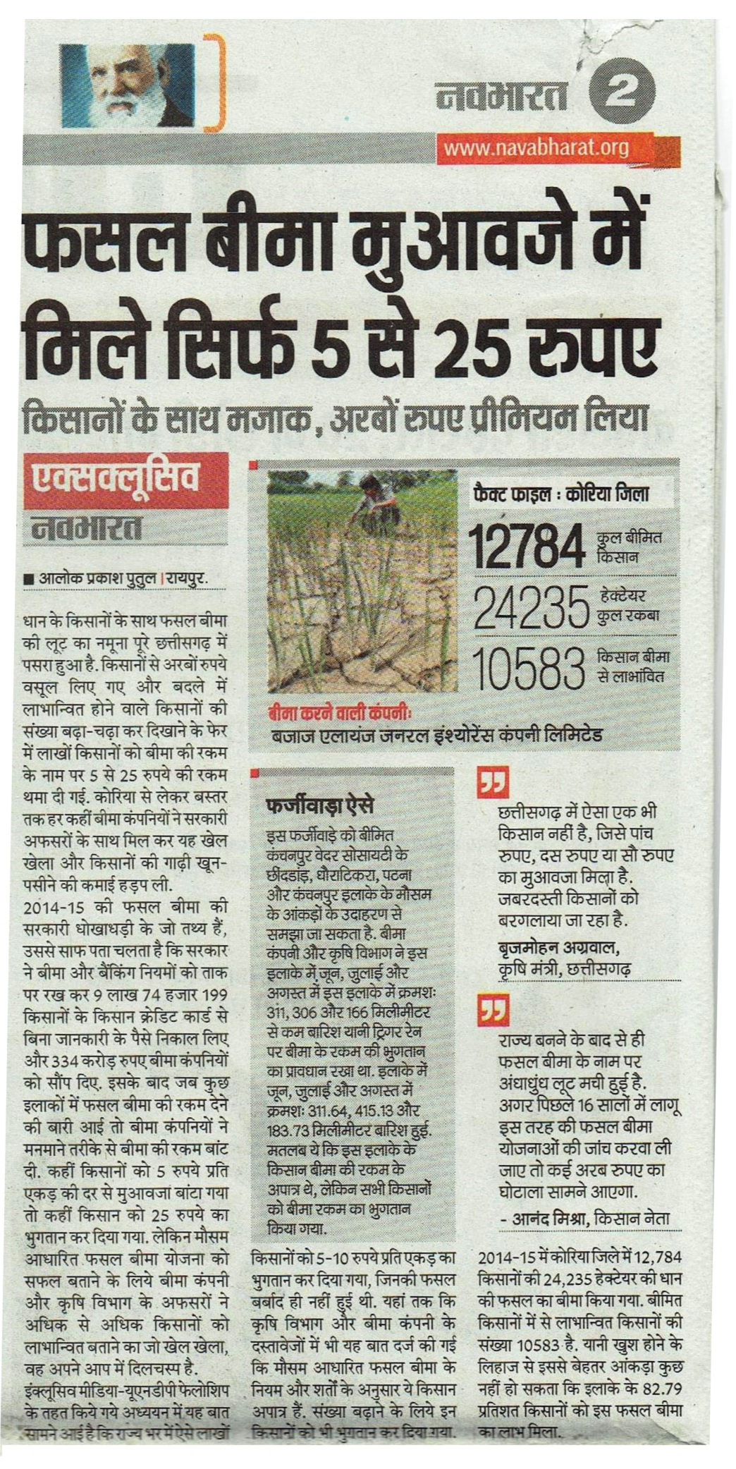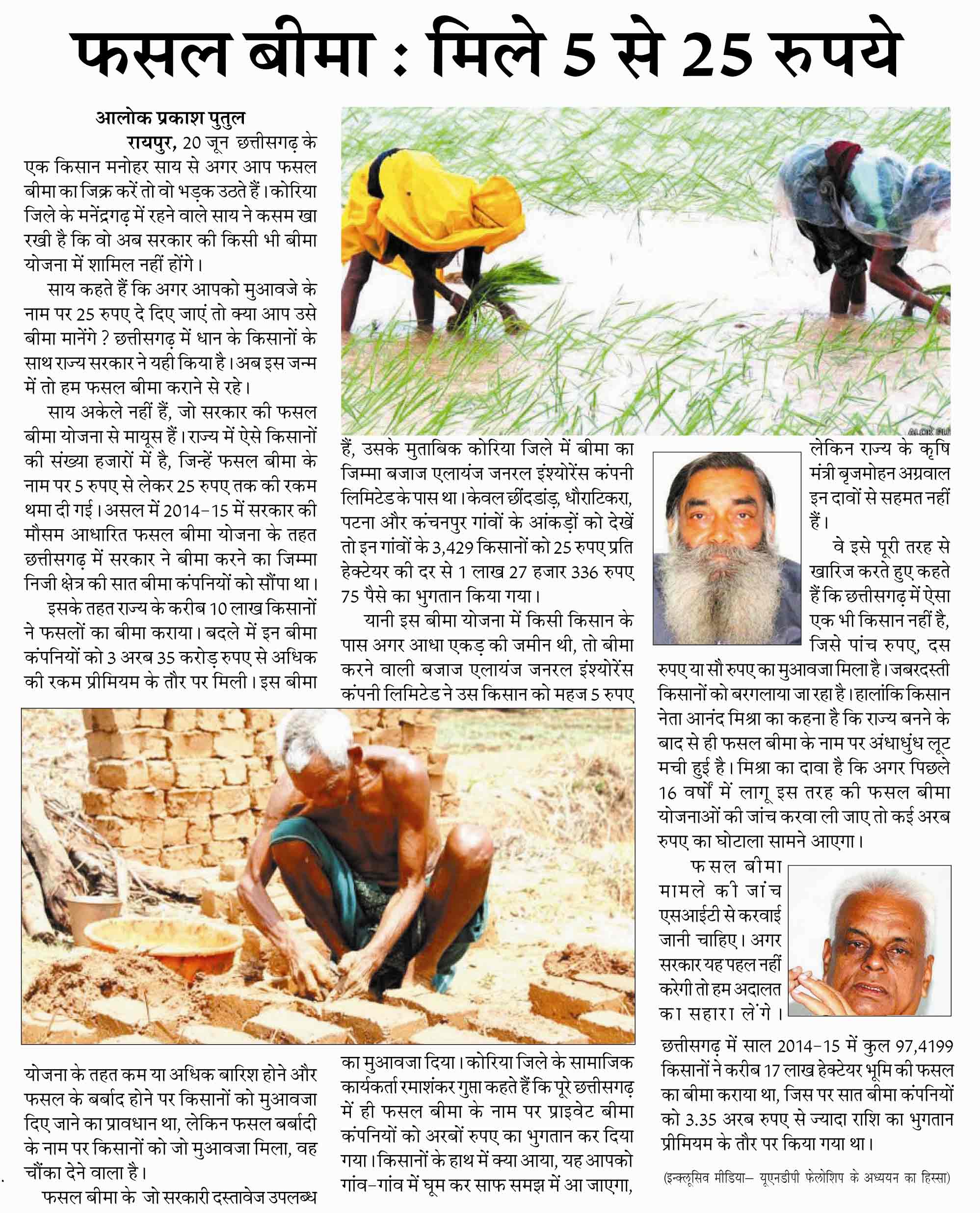 - 3. फसल बीमाः मिले 5 से 25 रुपये -Alok Prakash Putul, Daily Chhattisgarh, Raipur, 20 June 2016