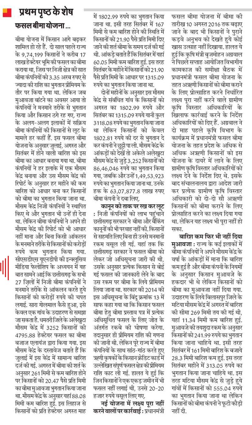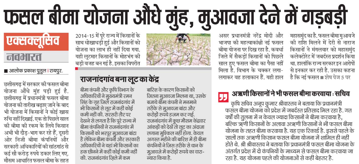 - 7. फसल बीमा, निजी कंपनियो की कई सौ करोड़ की लूट -Alok Prakash Putul, Daily Chhattisgarh, 14 अक्टूबर 2016