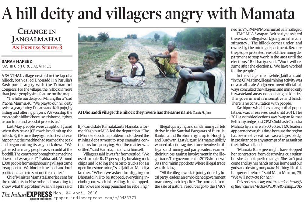 - 4. A hill deity and villagers angry with Mamata -Sarah Hafeez, The Indian Express, 4 April, 2016.