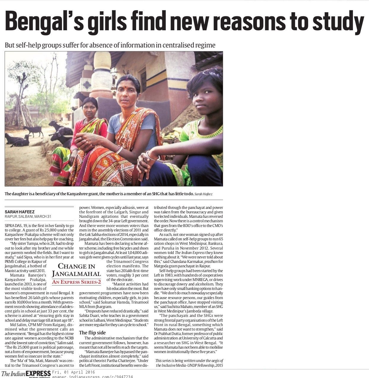 - 3. Bengal’s girls find new reasons to study -Sarah Hafeez, The Indian Express, 1 April, 2016.