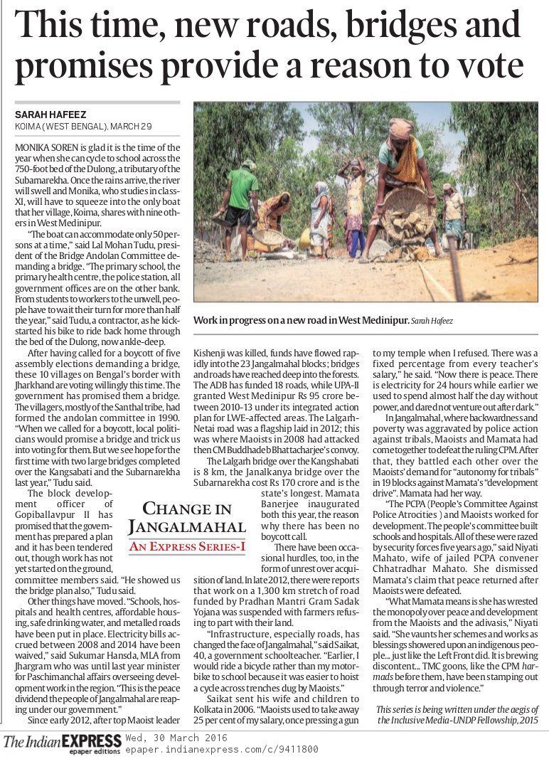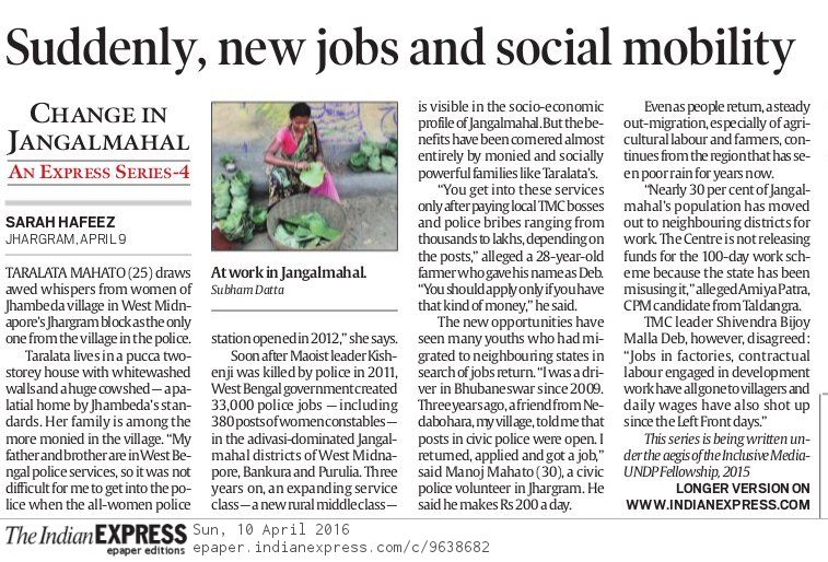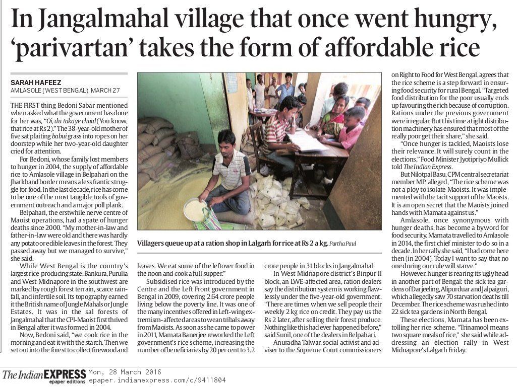 - 1. In Jangalmahal village that once went hungry, ‘parivartan’ takes the form of affordable rice -Sarah Hafeez, The Indian Express, 28 March, 2016.