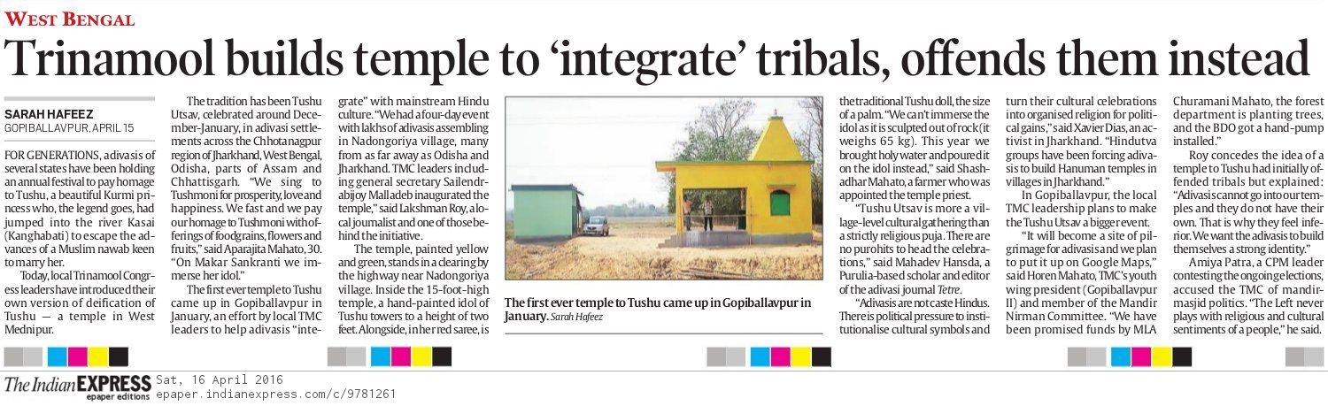 - 6. Trinamool builds temple to ‘integrate’ tribals, offends them instead -Sarah Hafeez, The Indian Express, 16 April, 2016.