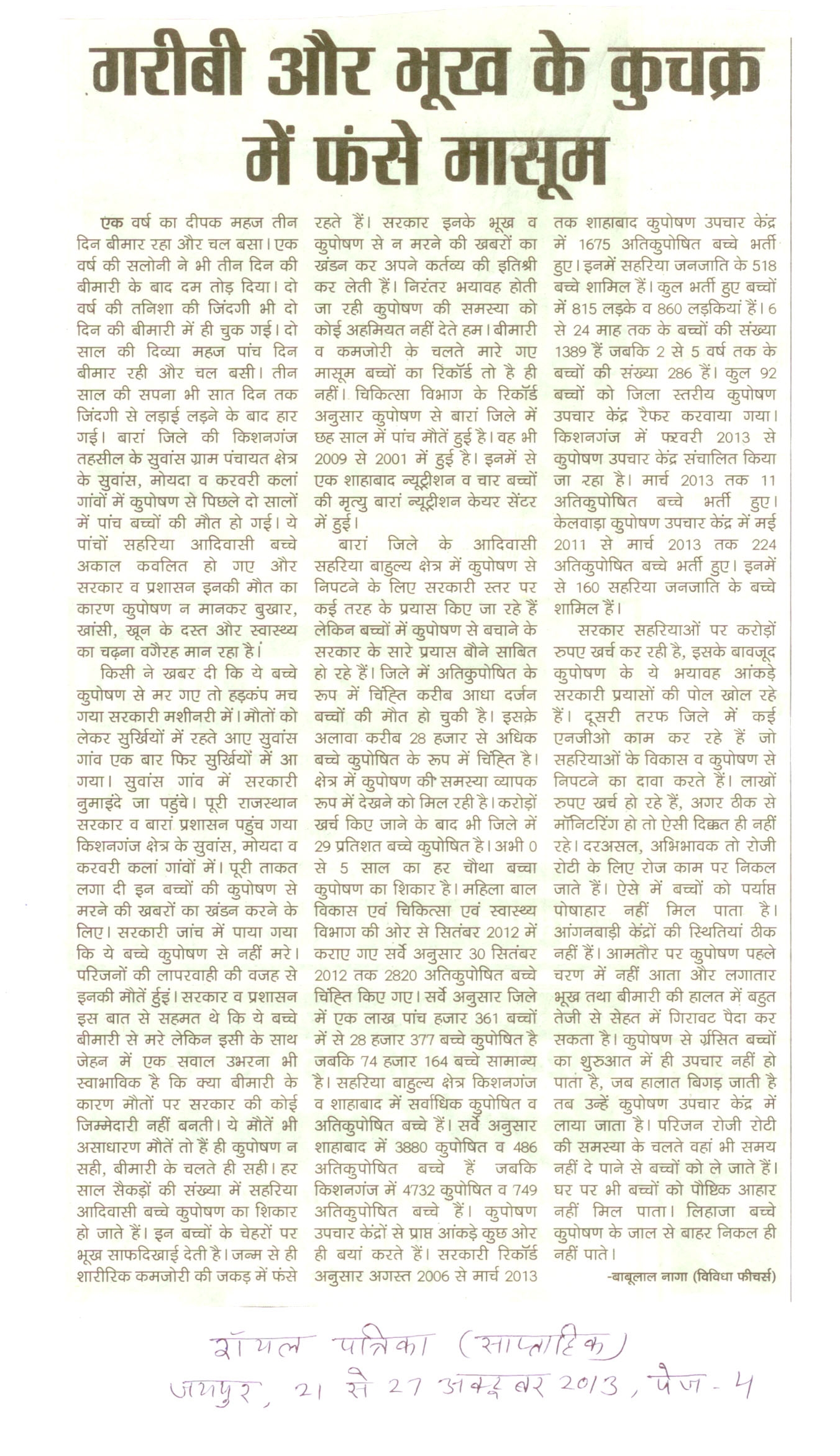 - Article 11: कुपोषण की मार झेलते मासूम- जनज्वार डॉटकॉम, 6 अक्तूबर 2013