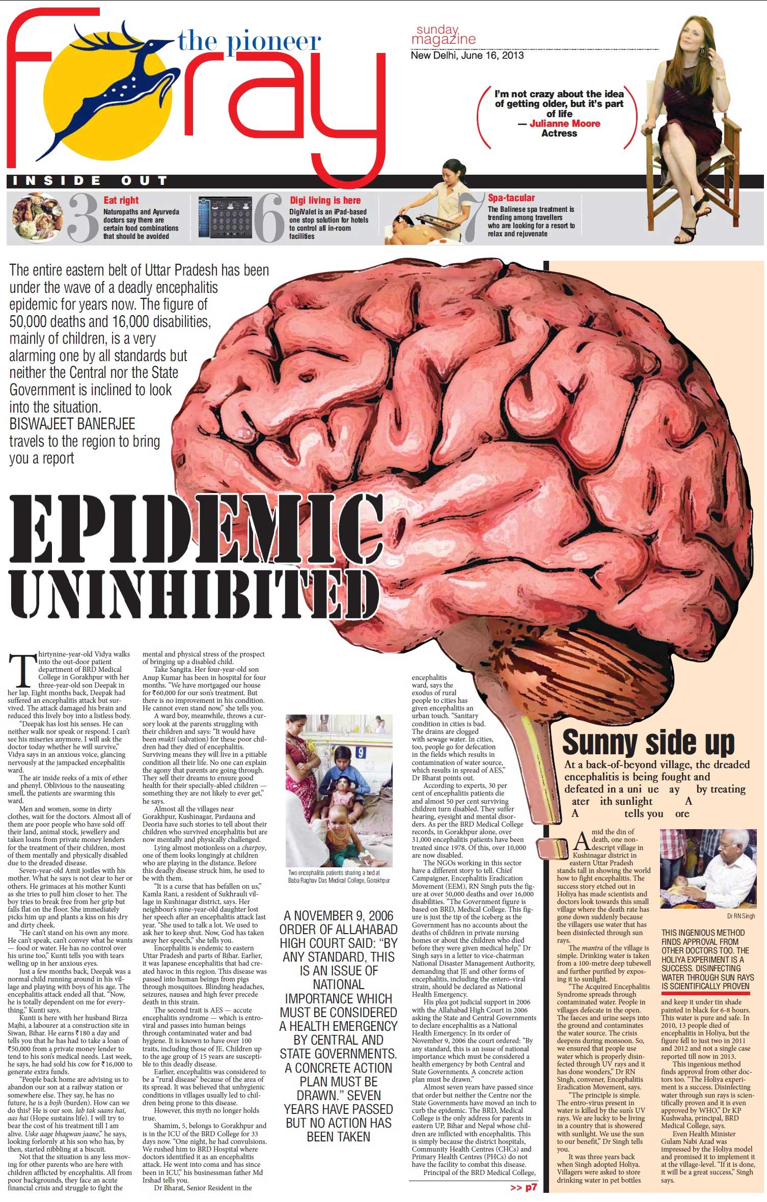 - Article 7: PHCs ill-equipped for encephalitis treatment by Biswajeet Banerjee, 14 June 2013, The Pioneer Lucknow