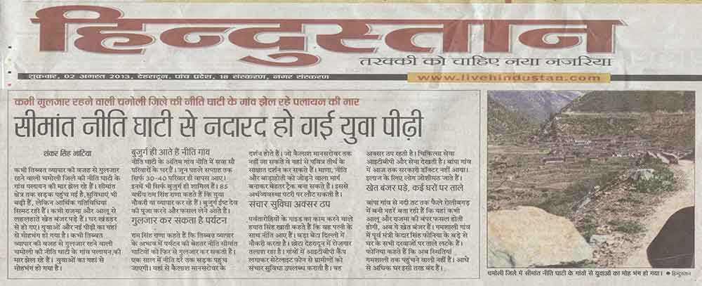 - Article 3: सीमांत नीति घाटी से नदारद हो गई युवा-पीढ़ी- दैनिक हिन्दुस्तान 2 अगस्त2013
