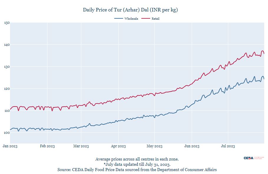 Centre for Economic Data and Analysis, Ashoka University Retail prices of Tur (Arhar) dal jumped from INR 110.5 per kg on average across the country at the beginning of the year to INR 135.7 per kg by July 31, 2023. Prices of this dal have risen faster than the overall food prices. Even as the sharp surge in tomato prices in recent weeks has caught everybody’s attention, another essential kitchen staple – Tur (also called Arhar) dal – has been seeing a steady jump in prices in recent months in India. From costing INR 110.5 per kg on average across the country to consumers at the beginning of the year, the retail price of this lentil had jumped to INR 135.7 per kg by July 31, 2023, a jump of almost 23 percent in seven months. Wholesale prices too jumped by a similar proportion (22.6 percent), going from INR 101.3 per kg on January 01, 2023 to INR 124.2 per kg by July 31, 2023. (Figure 1a). A similar spike has not been observed in the price of other pulses