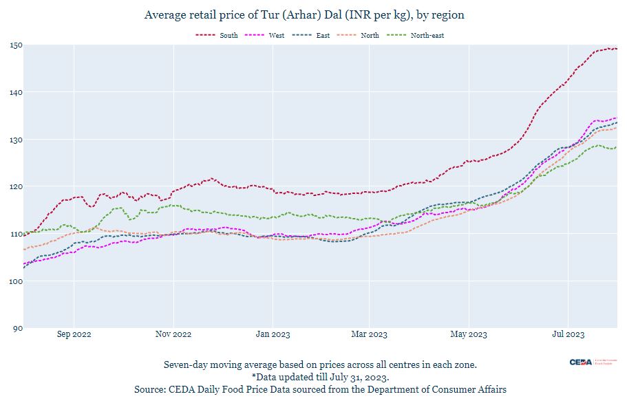 Akshi Chawla, Centre for Economic Data and Analysis, Ashoka University, 7 August, 2023, https://ceda.ashoka.edu.in/tur-nomics-prices-of-indias-favourite-dal-heat-up/