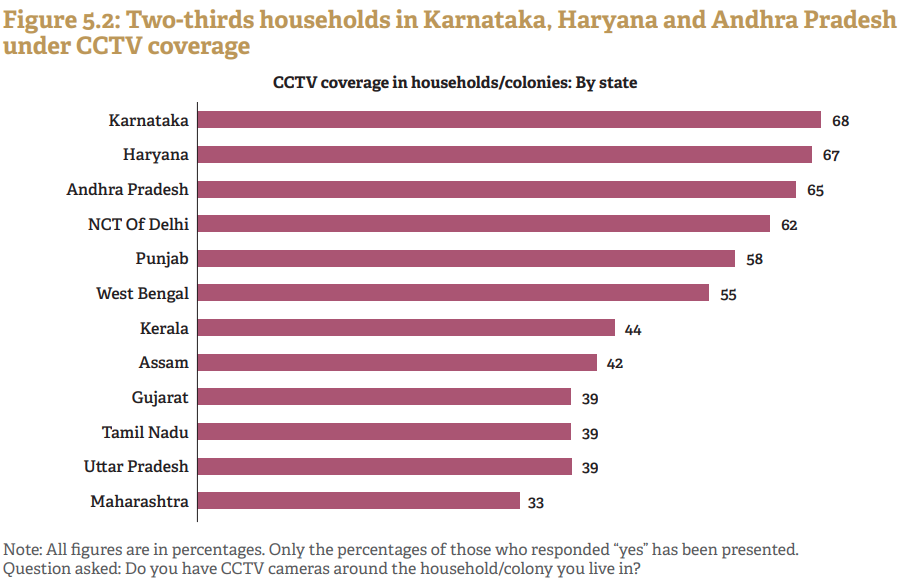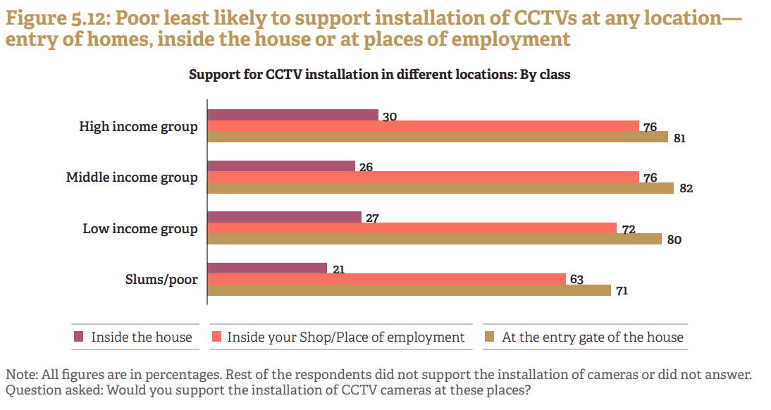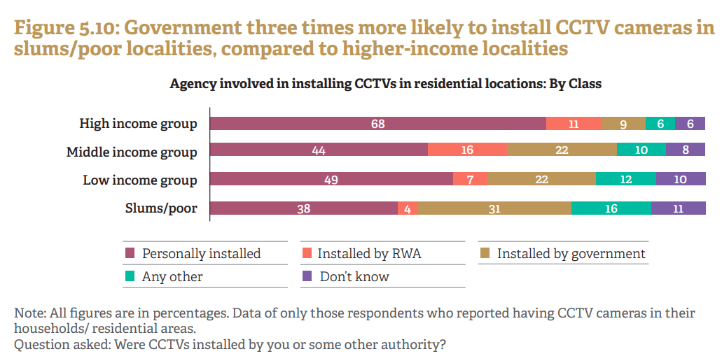 The highest proportion of respondents reporting CCTV coverage in their residential areas were from the states of Karnataka, Haryana, and Andhra Pradesh. Well over 60 percent of respondents from the NCT of Delhi said that their residential areas have CCTV coverage. On the contrary, the least coverage was reported in Maharashtra, where one-third said that their households or residential colonies had CCTV cameras. Government more like to install CCTV cameras in slums
