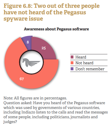 People were asked if they had ever heard of the Pegasus spyware. Two out of three people (67%) responded in the negative, while just a quarter of the respondents (25%) said that they had heard of Pegasus spyware (Figure 6.8). To further probe people’s opinions on the issue, the respondents were asked whether the government should use such spyware on different categories of people. Out of all categories of people listed in the table below, respondents were most likely to strongly support such targeted surveillance of suspected criminals (43%). Please click here to access SPIR 2023 |