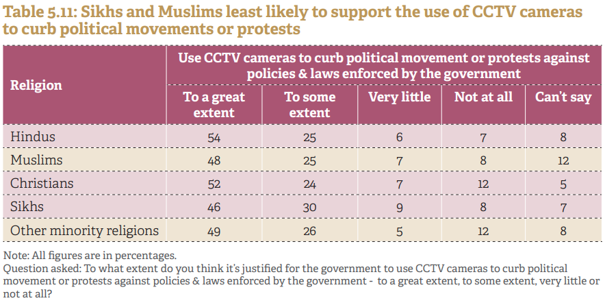 Nearly 95 percent of the respondents in Gujarat justified the government’s use of CCTV as a means to control political movements of all sorts (Table 5.9). Two-thirds of the respondents from Uttar Pradesh and Haryana (65% and 64% respectively) completely supported the use of CCTV in clamping down on protests. In these three states, there was an extremely small proportion of people who were against CCTVs being used by the state for political purposes. All three states are currently ruled by the BJP. However, respondents from West Bengal, Punjab and Karnataka were not as enthusiastic in their support. Only one[1]third of the respondents (29%) from Bengal completely justified the use of surveillance footage to curb dissent. The number is slightly higher in Punjab (36%) and Karnataka (37%). Sikhs, Muslims least likely to support CCTV camera to curb protest