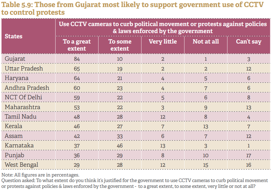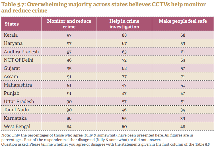 Across the states in which this study was conducted, nearly all respondents from Kerala, Haryana, and Andhra Pradesh (97% each) felt that CCTVs help in monitoring and reducing crime. Notably, in Tamil Nadu, a third of the respondents (34%) felt that CCTVs make people feel safer, yet 90 percent believe that they aid in crime reduction. Those from West Bengal were most sceptical (84%) about the importance of CCTVs in controlling crime and were least likely to agree that it reduces crime. Gujaratis most likely to support government use of CCTV to control protest