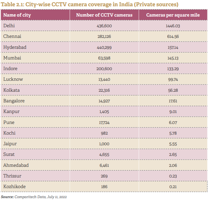 The table above shows the number of closed circuit television cameras (CCTV) installed in Indian cities and their density per square mile. On both counts Delhi, Chennai and Hyderabad are the most surveilled cities in India. The data has been obtained from private sources.