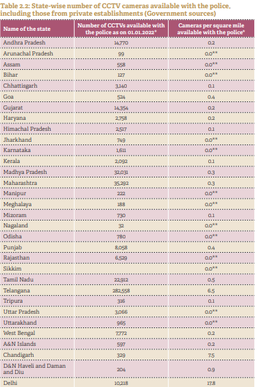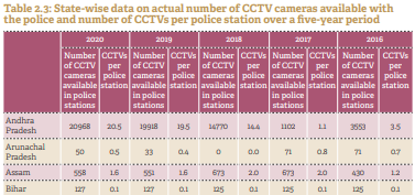 Table 2.3 shows the increase in CCTV cameras across five years (2016-20). The data indicates massive increases in states like Telangana, Tamil Nadu and Maharashtra. Extent of CCTV coverage in urban India